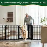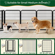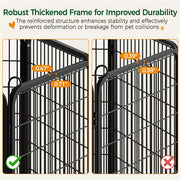 • Safety & Security: Ensuring the safety of your pets is of utmost importance to us. Our exercise pen is crafted with appropriate bar spacing and the latches that lock automatically as you close the door. Rounded edges also protect animals while preventing damage to wood or PVC floors. Additionally, stakes anchor the panels firmly to the grass or soft ground.