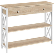 Sturdy and Durable: This foyer table is constructed of CARB P2 MDF and high-quality iron, ensuring a long life span; the whole console table is covered by frosted coating, and the entire frame is durable and stable; the table top can bear up to 198 lb, each shelf can bear up to 55 lb and the drawer can take up 22 lb. The X structures on both sides are made for enforcement.