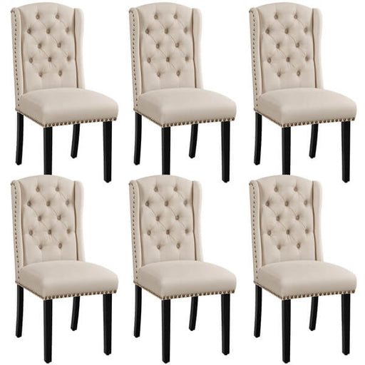 View full detailsSet of 6 Fabric Upholstered Dining Chairs, Classic Button Tufted Kitchen Chairs with Wing Design Backrest, Nailhead Trims, and Solid Wood Legs, Bei...