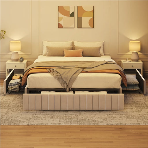 View full detailsFull/Queen Size Modern Upholstered Bed Frame with Storage, Platform Bed with Three Storage Drawers, No Fixed Headboard, Upholstered Mattress Founda...