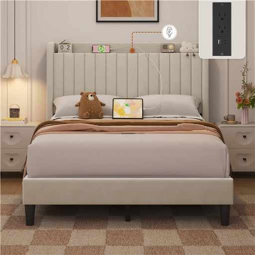 View full detailsUpholstered Bed Frame, Velvet Bed Frame with Charging Outlets & USB Ports / Storage Headboard with Charging Station / Vertical Channel Tufted H...